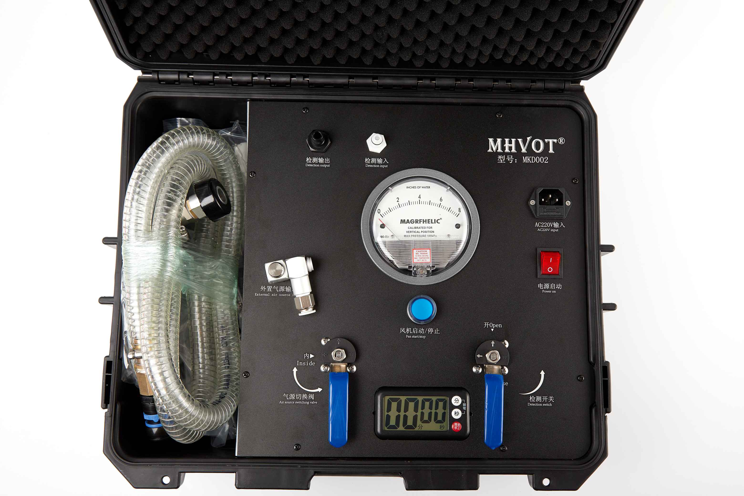 检测原理:防化服检测仪主要由内置电动供气源、压力计、计时器以及供气管路组成,充气测压变化。